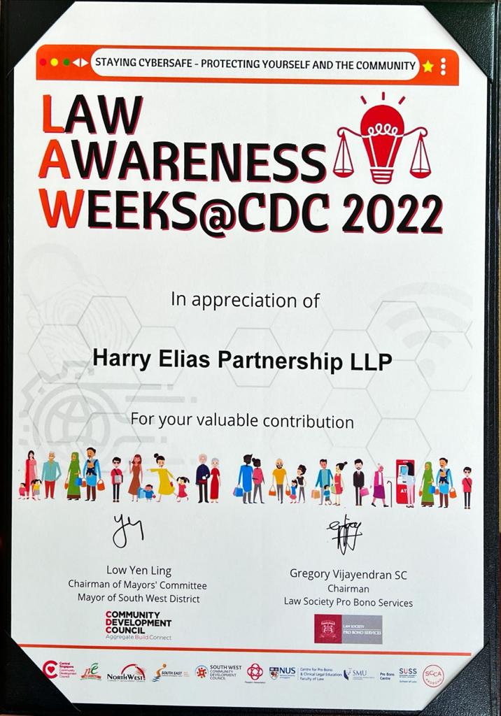 We are pleased to announce that at the Law Awareness Week@CDC 2022, Harry Elias Partnership was awarded a Certificate of Appreciation by Minister of State, Ministry of Culture, Community and Youth & Ministry of Trade and Industry Chairperson of Mayors’ Committee & Mayor, South West District Ms Low Yen Ling and former President of the Law Society, Mr Gregory Vijayendran.