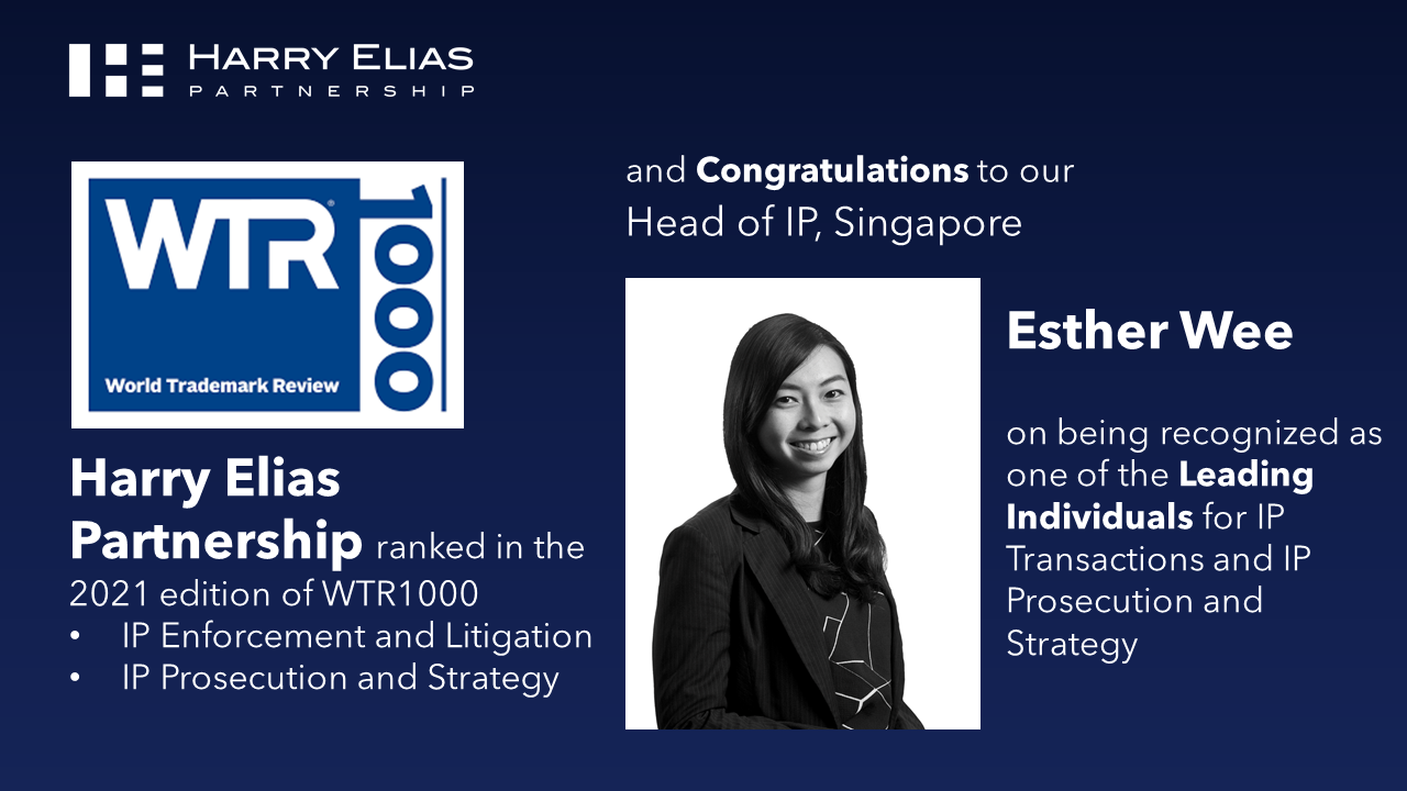 Harry Elias Partnership LLP has been ranked in IP Prosecution and Strategy and IP Enforcement and Litigation, while Esther has been listed as one of the Leading Individuals for IP Transactions and IP Prosecution and Strategy.