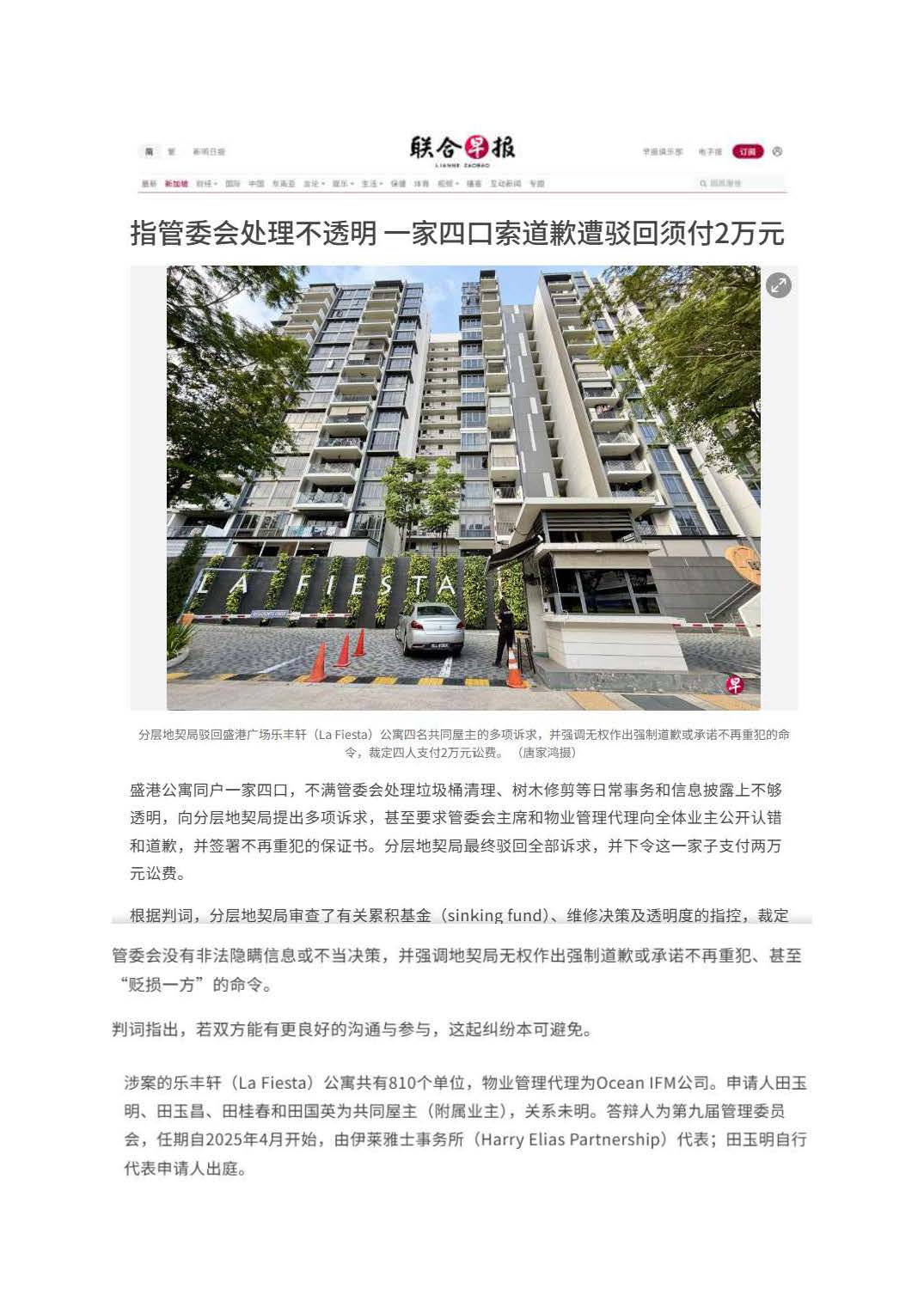 Our Partner Kok Yee Keong and Senior Associate Faith Quek represented the MCST to successfully resist a strata titles board application brought by subsidiary proprietors of a unit. This matter was reported by the Lianhe Zaobao’s article dated 12 April 2026 titled “A family of four which accused a Management Corporation Strata Title of lacking transparency in handling matters and demanded an apology were refused and ordered to pay S$20,000”.