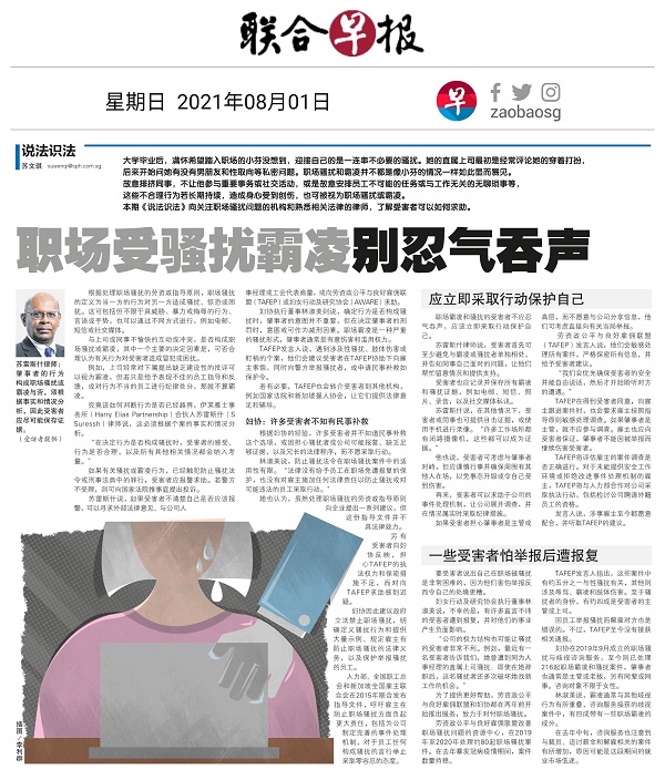 Harry Elias Partnership Partner and Head of Employment Suressh S was quoted in the local Chinese newspaper, Lianhe Zaobao, on 1 August 2021, on his opinion on workplace bullying and harassment. Suressh shared his thoughts on what defines workplace bullying and harassment, what is not considered workplace bullying and harassment, how can the victims seek help and recourse and what are the provisions under the law that protect the employees.