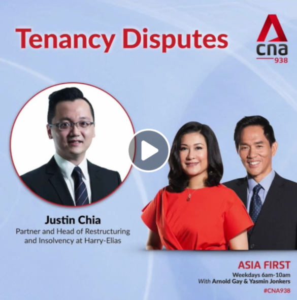 Harry Elias Partnership Partner and Head, Restructuring and Insolvency Justin Chia was recently interviewed on Asia First, the CNA938’s breakfast show. He shared his thoughts on tenant-landlord conflict in Singapore with presenters Arnold Gay and Susan Ng.