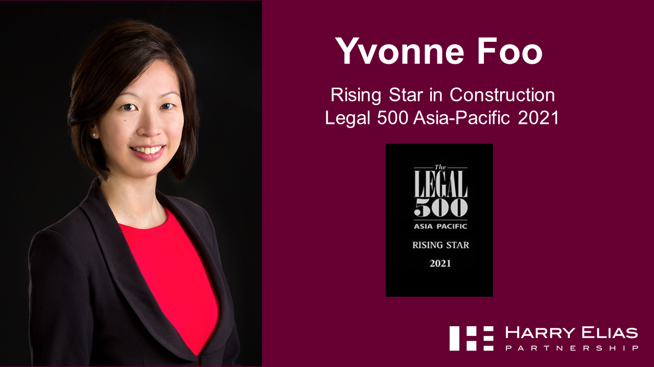 Harry Elias Partnership LLP is pleased to share that our Partner Yvonne Foo has been named a Rising Star in Construction by The Legal 500 (Legalease) Asia-Pacific 2021. The accolade recognises Yvonne’s highly regarded skills and expertise in construction law.