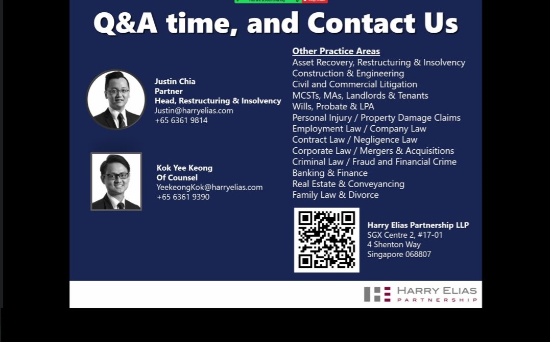 Our Partner Justin Chia (Head of Insolvency and Restructuring), together with our Of Counsel Kok Yee Keong (Litigation and Dispute Management), gave a presentation to Abacus Property Management Pte Ltd n the recovery of MCST arrears and other MCST related issues on 1 October 2022.