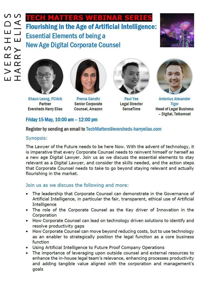 Join us at our Tech Matters Webinar “Flourishing in the Age of Artificial Intelligence: Essential Elements of being a New Age Digital Corporate Counsel” on 15 May 10:00 am- 12:00 pm.